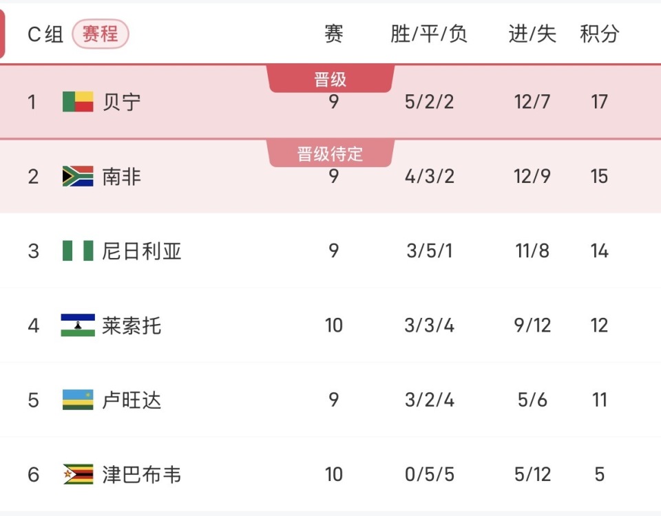 在最后一轮比赛之前,贝宁9轮5胜2平2负积17分领跑C组,领先第二名的南非2分,领先第三名尼日利亚3分,在世非预仅剩一轮的情况下,贝宁有很大的概率可以创造历史,有望第一次打入世界杯决赛圈;