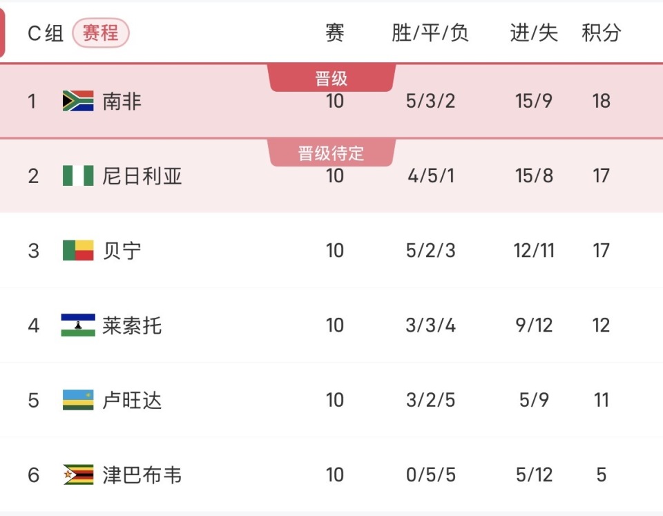 雷速体育10月15日讯 在刚刚结束的世界杯非洲区预选赛两场C组的关键战中,南非3-0完胜卢旺达成功登顶小组第一,直通美加墨世界杯;奥斯梅恩上演帽子戏法帮助尼日利亚在最后一轮4-0大胜贝宁,成功跻身小组第二,获得世界杯附加赛资格。